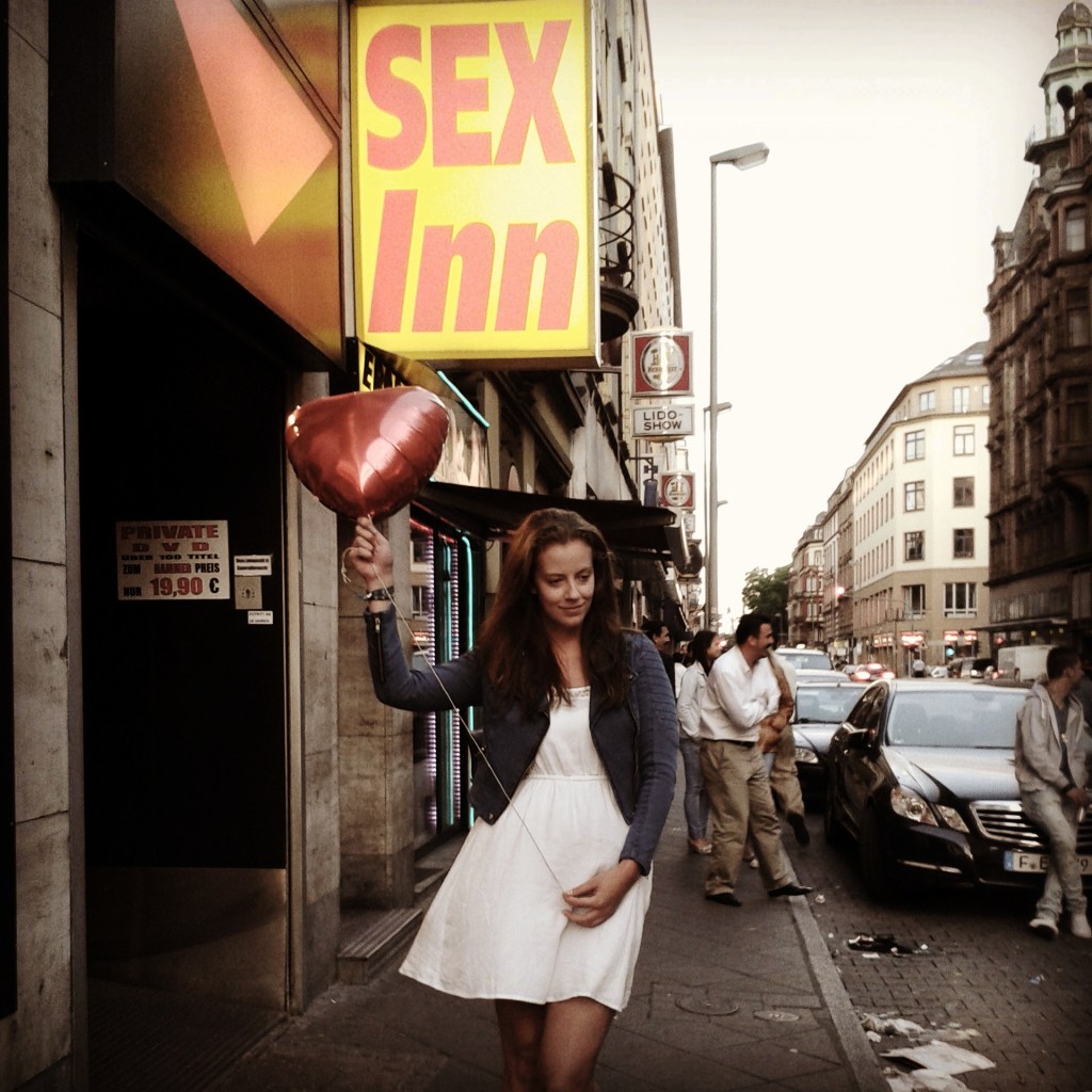 Wir fuhren also einigermaßen nervös zum Hauptbahnhof und marschierten von da aus mit der schweren Ausrüstung die Kaiserstraße hinab. Wir hatten uns bei unserem Scouting einige Monate zuvor schon eine tolle Ecke ausgesucht, die einfach perfekt war: So richtig schön verratzt, mit einem großen Leuchtschild und zahlreichen Symbolen und Aufforderungen in den Fenstern. Deliah, die absichtlich gekleidet war wie ein kleines Unschuldsengelchen, warf ihre Chucks von den Füßen und streifte sich die High Heels über, während Robin und seine Freundin Nina in Windeseile den Blitz aufbauten.