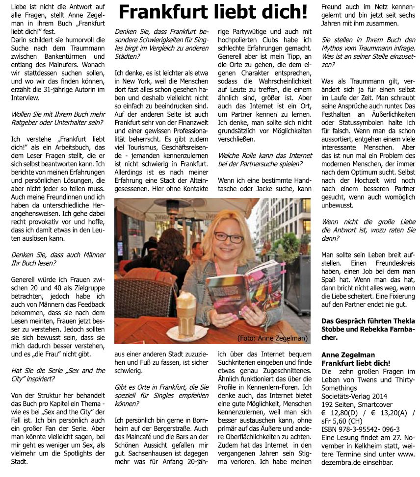 Am Dienstag ist das Interview erschienen, das ich dem Frankfurter Stadtkurier gegeben habe. Ich finde, es ist wirklich ausgezeichnet gelungen. :) Das wundert mich aber eigentlich auch gar nicht, denn das Telefoninterview mit den Redakteurinnen Rebekka Farnbacher und Thekla Stobbe hat so viel Spaß gemacht, dass es sich eher angefühlt hat wie ein Gespräch mit guten Freundinnen. Die beiden haben die Essenz unseres 45-minütigen Geplauders gut eingefangen. Nur einmal kam ich etwas ins Schleudern. Dann nämlich, als sie mich gefragt haben, wo Single-Frauen denn am besten hingehen sollten, um einen Mann kennenzulernen. Tja, wo nur?