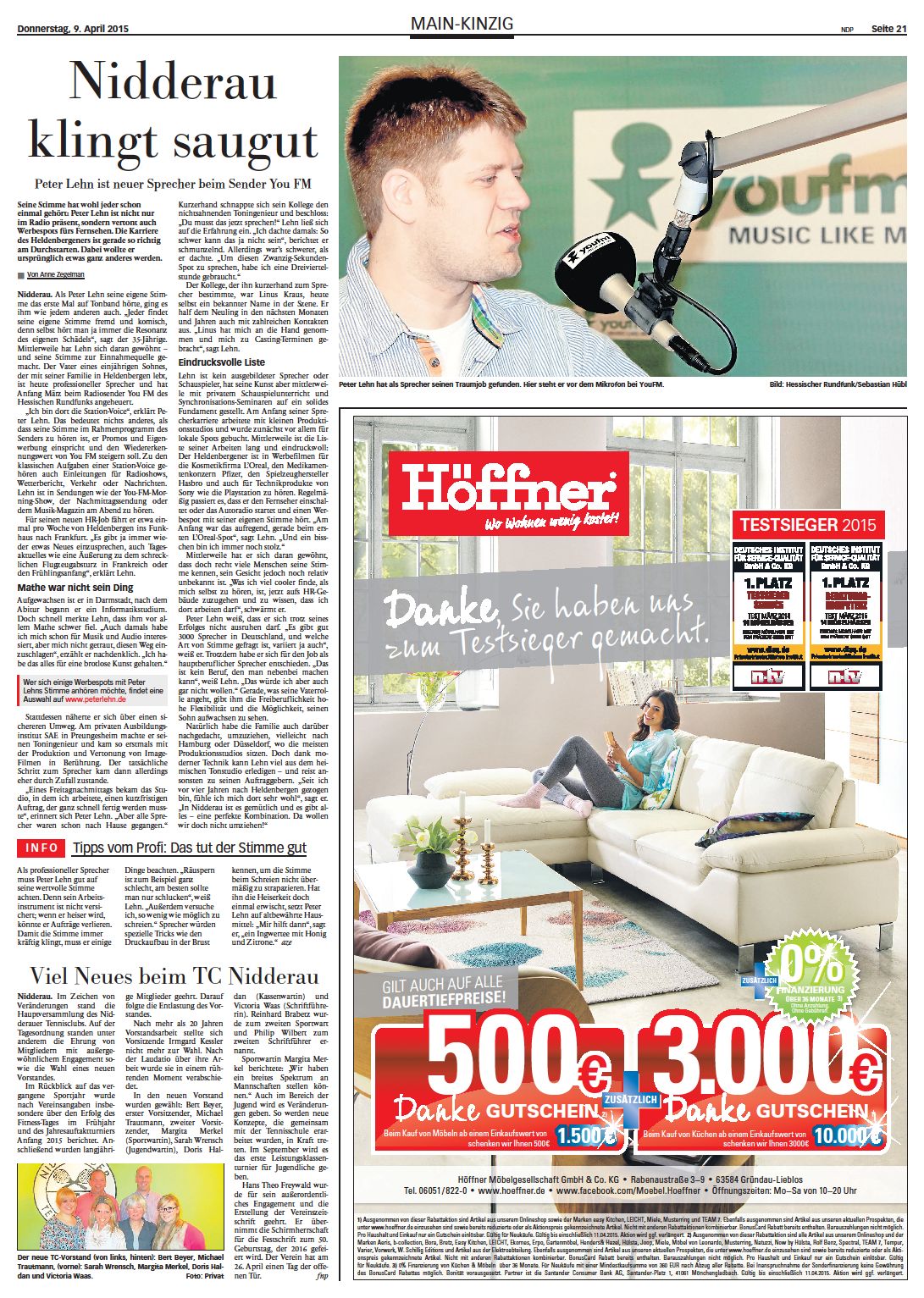Vergangene Woche hatte ich die große Freude, Peter Lehn kennenzulernen. Er ist professioneller Sprecher für internationale Marken – und wohnt ausgerechnet in einem der kleinen Orte, die ich als Redakteurin betreue. :) Ausschlaggebend für das Portrait, das in der heutigen Ausgabe der Frankfurter Neuen Presse erschienen ist, war, dass Peter gerade einen Vertrag als brandneue Station Voice des Radiosenders You FM (Hessischer Rundfunk) unterschrieben hat. Er ist dort jetzt sozusagen des akustische Maskottchen und gleich mehrmals pro Stunde in sendereigenen Werbeclips zu hören.