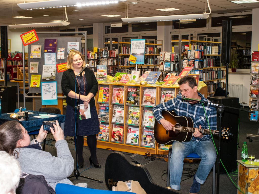 Am Donnerstagabend sind wir in der Stadtbücherei Schwalbach aufgetreten. Und diesmal waren gleich drei Hobby-Fotografen im Einsatz, so dass wir jede Menge schöne Fotos von der Lesung haben.