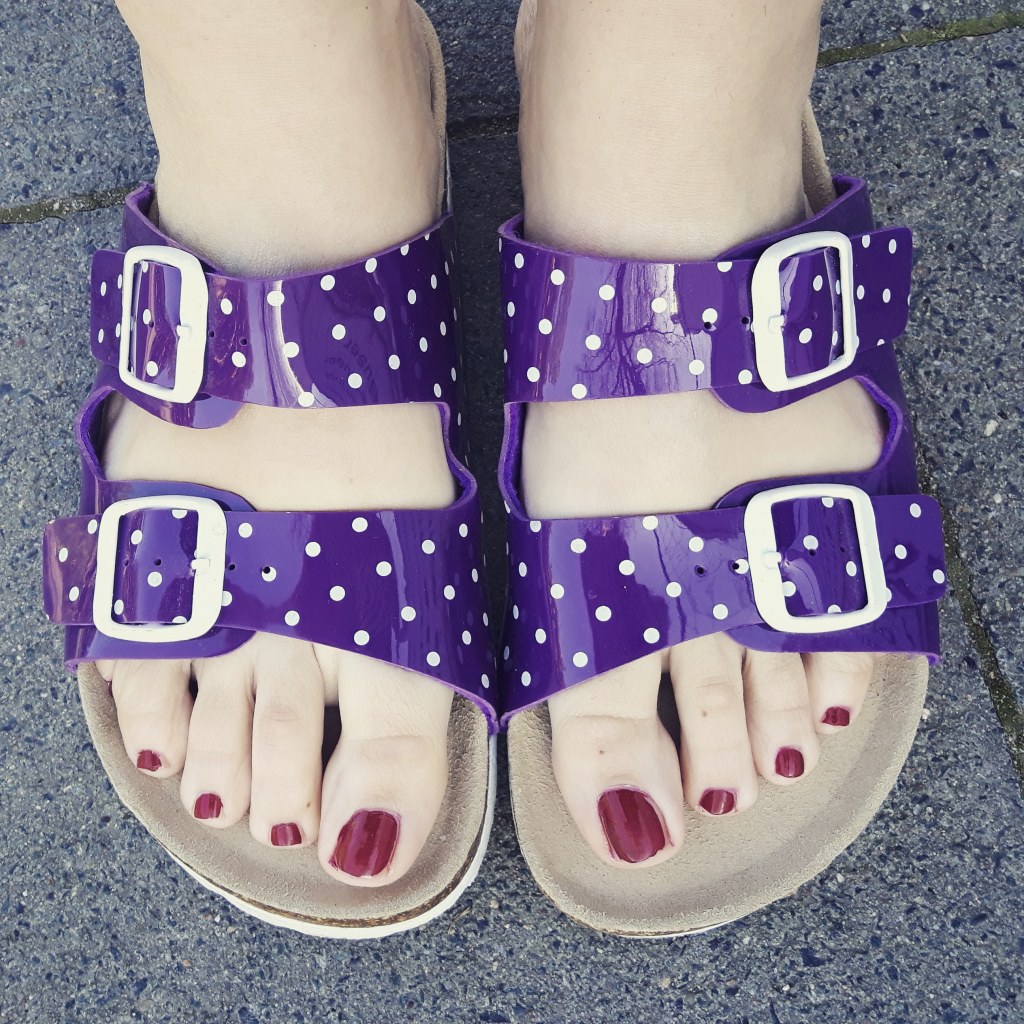 Eine Ausnahme gibt es allerdings: Da ich nur 1,60 Meter groß bin, trage ich bei Lesungen gern hohe Absätze. Und das, obwohl ich im „echten“ Leben fast nie auf hohen Hacken unterwegs bin – und zu allem Überfluss auch noch immer stehend lese. Aber ich fühle mich einfach mehr als mein Bühnen-Ich, wenn ich Absätze trage. Deshalb kommen die süßen lila Birkenstock-Lookalikes mit weißen Punkten, die ich gestern geshoppt habe, am Montag leider nicht zum Einsatz.