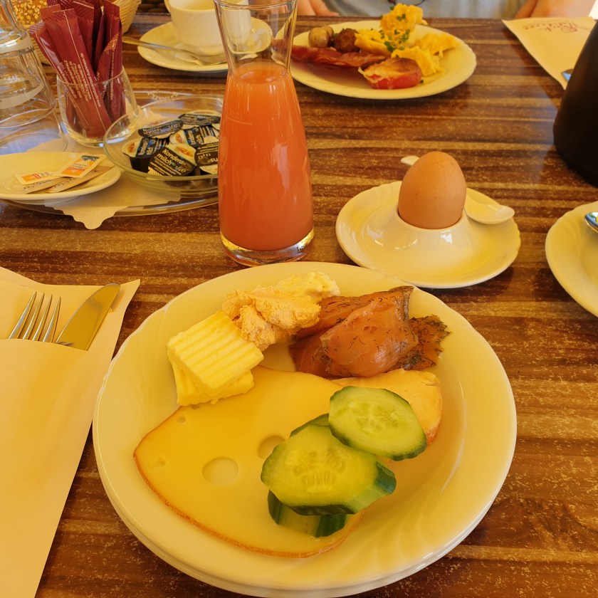 Man glaubt es nicht, aber es gibt in Hotels nach wie vor Frühstücksbüffets. Die funktionieren allerdings etwas anders als gewohnt. In unserem Fall gab es ein assistiertes Büffet, das heißt, man stand mit Maske brav in der Schlange an – und vorne angekommen bekam man eine Assistenz zur Seite gestellt, der man sagen konnte, was sie auf den Teller laden sollte. Das funktionierte zwar ganz gut, allerdings verkürzte das die lustvollen Was-will-ich-essen-Überlegungen doch ganz schön.
