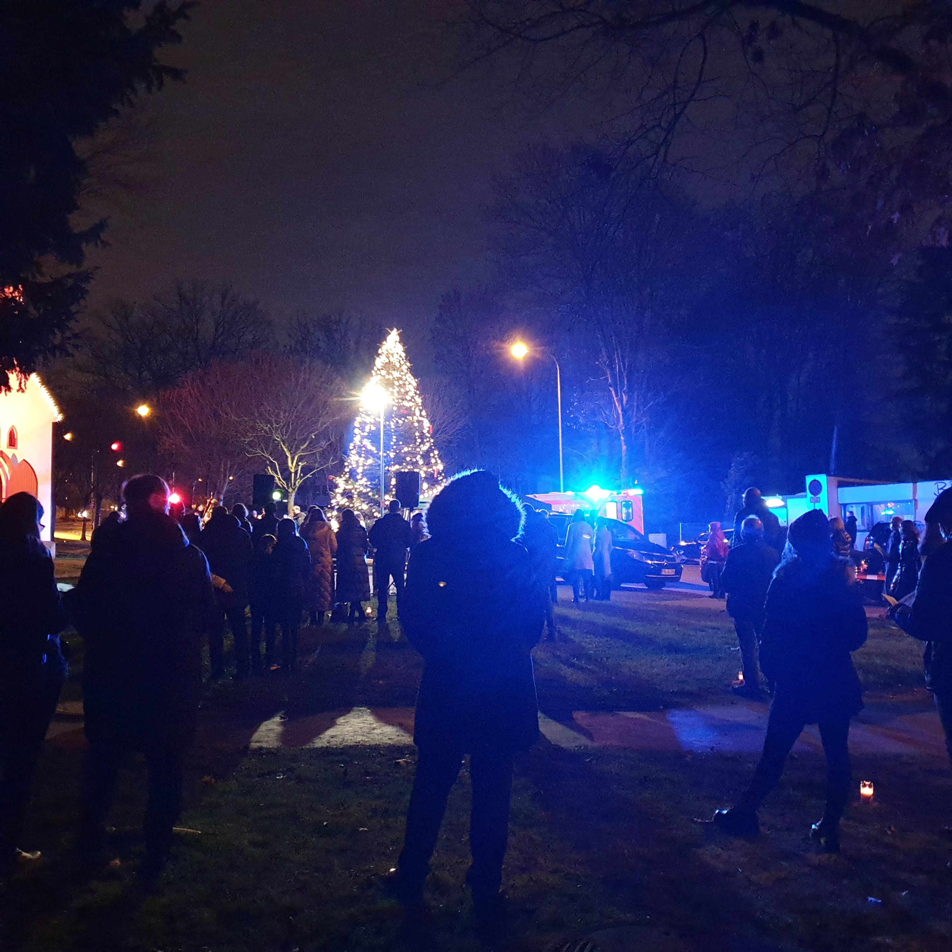 Wegen der Pandemie fand der Weihnachtsgottesdienst in Schwalbach am Taunus nun schon zum zweiten Mal draußen im Park vor der alten Kapelle statt. Das Organisationsteam hatte wieder viele brennende Kerzen auf den Boden gestellt, die als Abstandshalter dienten und außerdem ein wunderschön warmes Licht zauberten. Dazu noch der zauberhaft beleuchtete Weihnachtsbaum, neben dem der Posaunenchor sich positionierte, um „Freut Euch, Ihr Christen“ zu spielen. Ein goldener Lichterglanz also, der so richtig schön gemütlich wirkte.