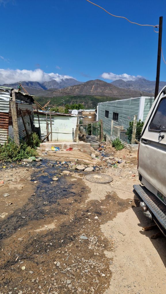 Ich befinde mich am Western Cape, also rund um die Region Kapstadt, die als reich und relativ sicher, landschaftlich wunderschoen und deshalb bei Touristen beliebt gilt. Mein Vater lebt hier in einem bewachten Estate namens Pearl Valley, was schon Sinn macht, wenn man bedenkt, dass auch hier die armutsbedingte Kriminalitaet gross ist. Im Township Langrug bei Franschhoek, etwa 15 Minuten mit dem Auto vom reichen Estate Pearl Valley entfernt, leben ungefaehr 10.000 Menschen in schlimmen Verhaeltnissen, es gibt Kindergaerten, Schulen, Kirchen, Supermaerkte (sogenannte Superettes) und so gut wie keine Baustandards fuer die Huetten, die deshalb regelmaessig einstuerzen und auch abbrennen. Es gibt kein fliessendes Wasser, nur oeffentliche Toiletten, die Menschen waschen sich und ihre Kleidung in Waschzubern mit kaltem Wasser. Wer warmes Wasser moechte, muss es mit teurem Strom im Wasserkocher erhitzen. Die Menschen bekommen vom Staat immerhin 1000 Units Strom im Monat zur Verfuegung gestellt, wenn die leer sind, muss zugekauft werden oder man sitzt im Dunkeln.