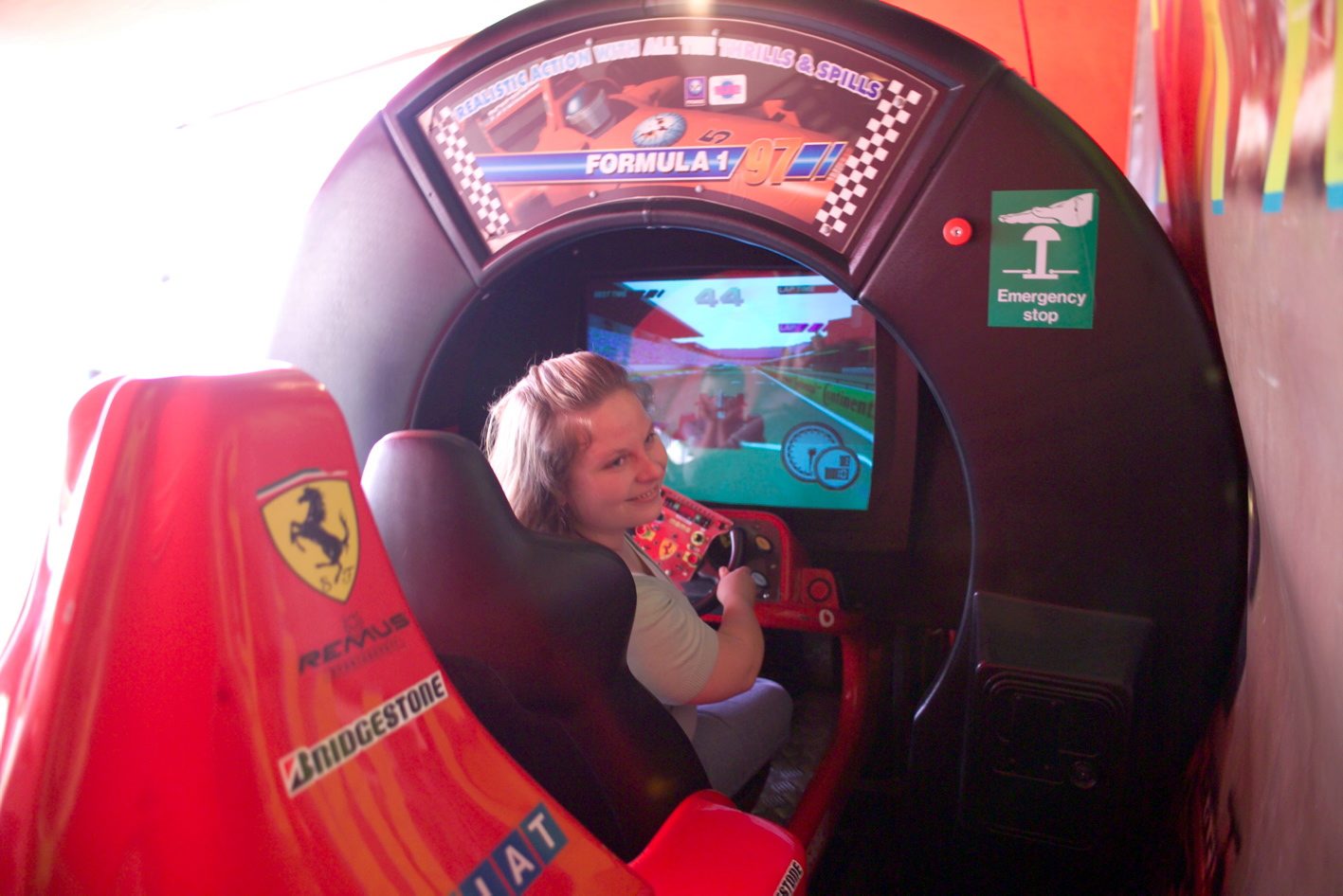 Undatierte Aufnahme: Ich beim Testen eines Autosimulators auf dem Kinderfest der Deutschen Bank in Eschborn. Foto: Franz Schmitt